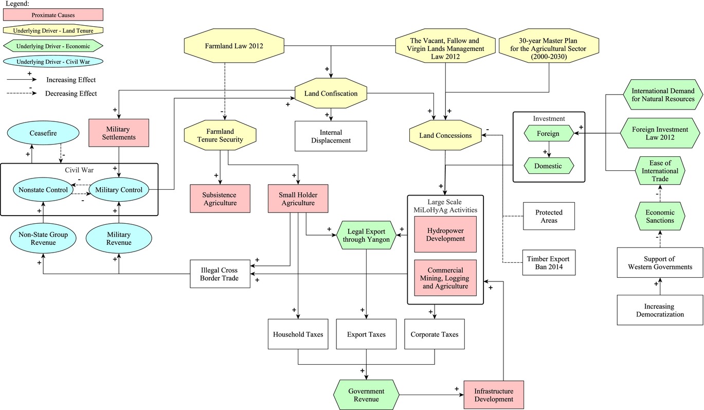 Political transitions often trigger substantial environmental changes. In particular, deforestation can result from the complex interplay among the components of a system—actors, institutions, and existing policies—adapting to new opportunities. A dynamic conceptual map of system components is particularly useful for systems in which multiple actors, each with different worldviews and motivations, may be simultaneously trying to alter different facets of the system, unaware of the impacts on other components. In Myanmar, a global biodiversity hotspot with the largest forest area in mainland Southeast Asia, ongoing political and economic reforms are likely to change the dynamics of deforestation drivers. A fundamental conceptual map of these dynamics is therefore a prerequisite for interventions to reduce deforestation. We used a system‐dynamics approach and causal‐network analysis to determine the proximate causes and underlying drivers of forest loss and degradation in Myanmar from 1995 to 2016 and to articulate the linkages among them. Proximate causes included infrastructure development, timber extraction, and agricultural expansion. These were stimulated primarily by formal agricultural, logging, mining, and hydropower concessions and economic investment and social issues relating to civil war and land tenure. Reform of land laws, the link between natural resource extraction and civil war, and the allocation of agricultural concessions will influence the extent of future forest loss and degradation in Myanmar. The causal‐network analysis identified priority areas for policy interventions, for example, creating a public registry of land‐concession holders to deter corruption in concession allocation. We recommend application of this analytical approach to other countries, particularly those undergoing political transition, to inform policy interventions to reduce forest loss and degradation.