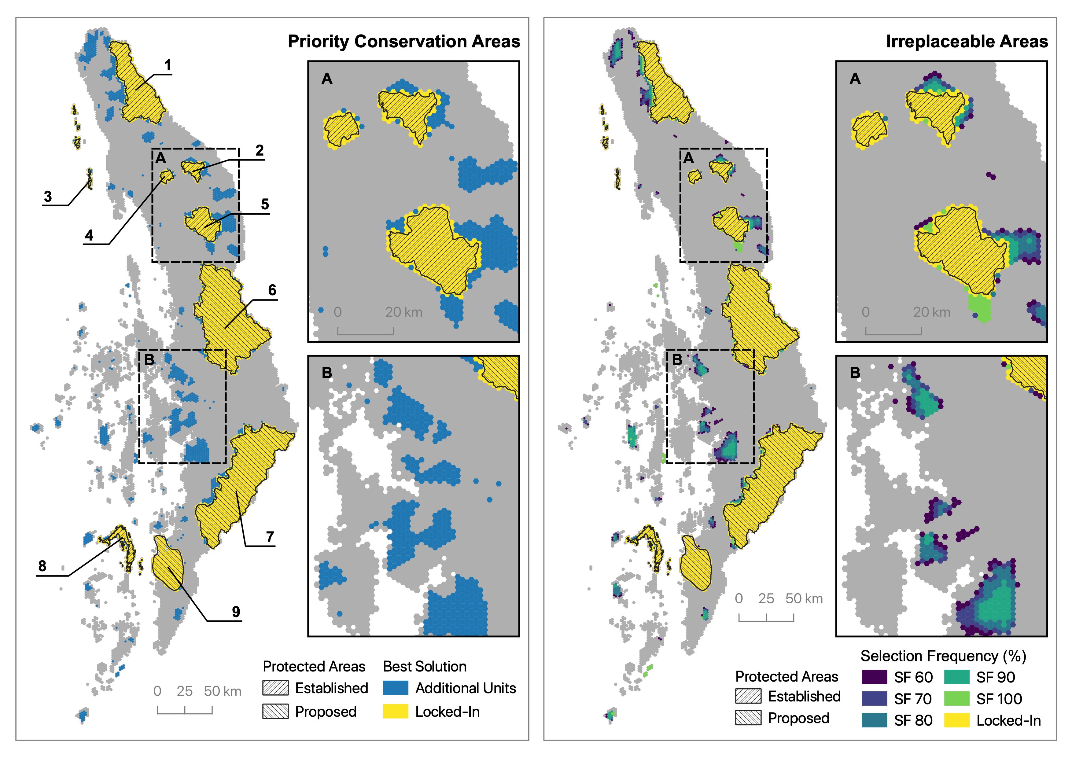 Priority conservation areas (left map panel) and irreplaceable areas (right map panel), identified using Marxan to enhance the effectiveness of the existing protected area network. Note that planning units with very high selection frequencies (90–100%) are regarded as irreplaceable areas. Map inset (A) shows identified conservation areas within and around established protected areas by the Karen National Union; map inset (B) shows identified conservation areas over mangrove forests along the coastline of Myeik District, Tanintharyi Region. Protected areas include: (1) Tanintharyi Nature Reserve, (2) Ler Nu Htee National Park, (3) Moscos Kyun Wildlife Reserve, (4) Ta Mae Klo Herbal Forest, (5) Kser Doh Wildlife Sanctuary, (6) Tanintharyi National Park (or Lem Muh Lah Conservation Area), (7) Lenya National Park (or Lenya Reserved Forest), (8) Lampi Island Marine National Park, and (9) Pakchan Nature Reserve.