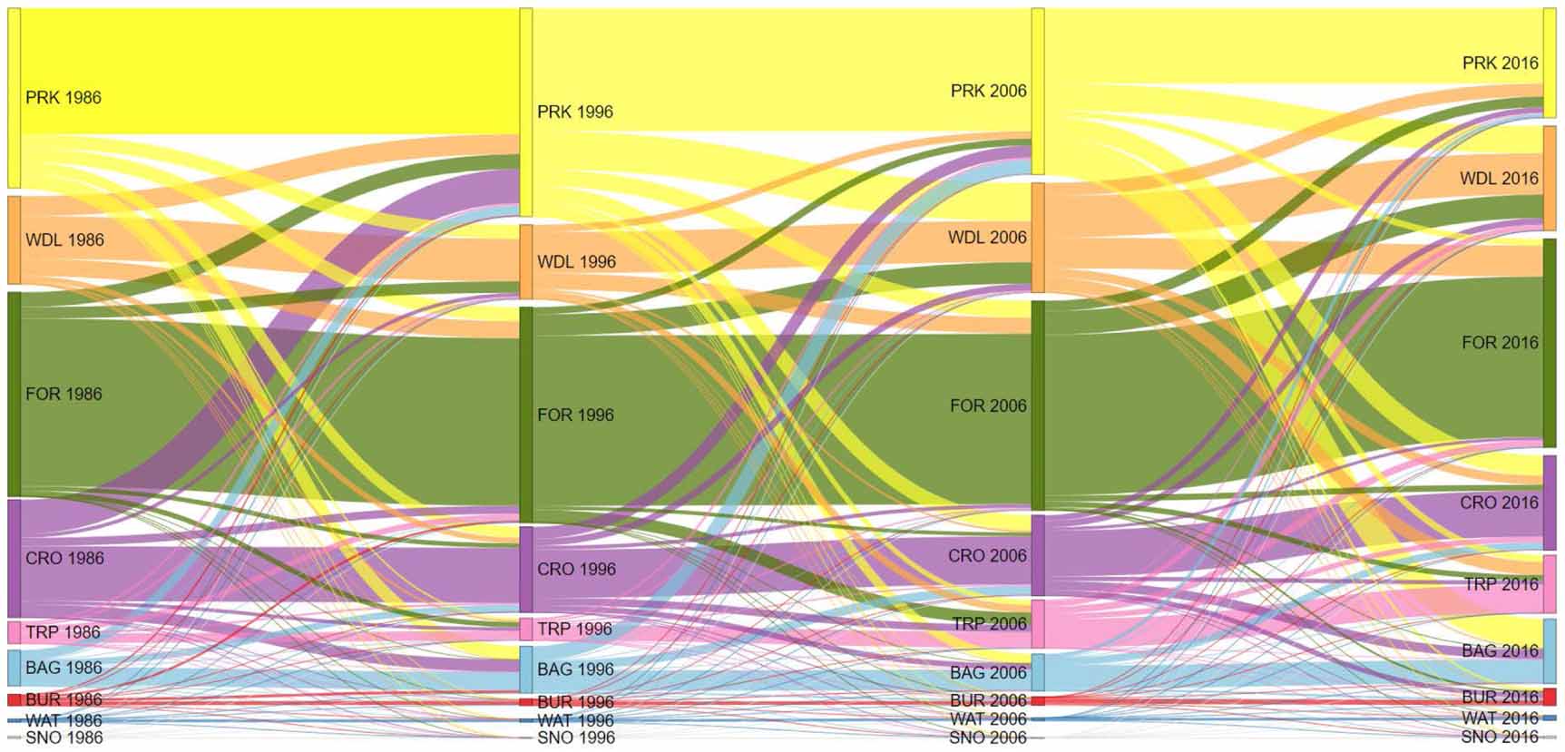 Sankey diagram of the land cover transitions in Yunnan Province, China from 1986 to 2016. Nodes indicate the land cover percentage for each particular time step, while the ribbons depict the transitions between land cover types. Colours follow that of the land cover map. Note: PRK: parkland, WDL: woodland, FOR: forest, CRO: cropland, TRP: tree plantations, BAG: bare ground, BUR: built-up area and bare rock, WAT: water bodies, SNO: snow.