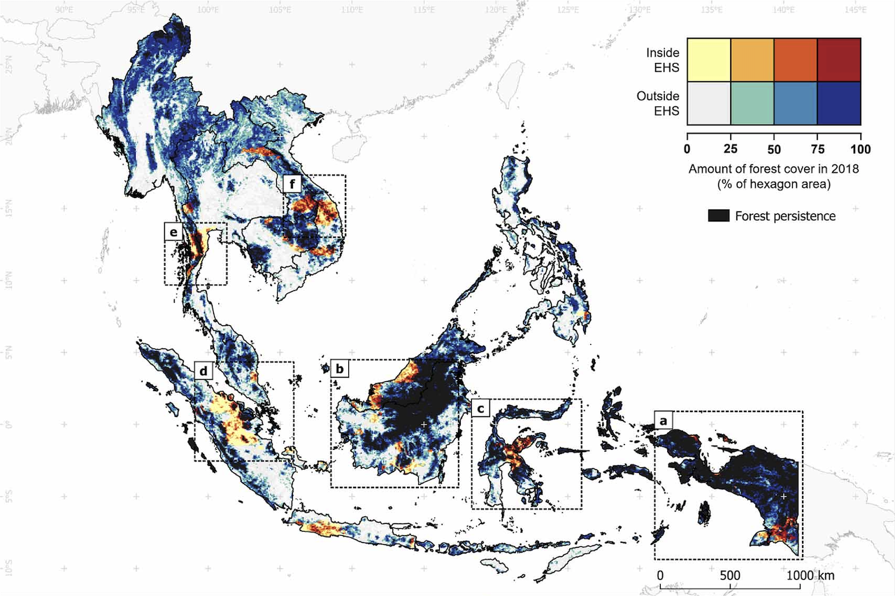 State of SE Asia’s remaining forest in emergent hot spots (EHS). Regional map (top) showing the amount of remaining 2018 ESA forest that occur inside and outside EHS, where each map unit is a 5 km circumradius hexagon (∼65 km2). Insets show the distribution of high, med (medium), and low integrity forest using the 2019 Forest Landscape Integrity Index (FLII) data for hot spots in (a) Papua, (b) Borneo, © Sulawesi, (d) Sumatra, (e) Tenasserim, and (f) southern Laos and central Vietnam.