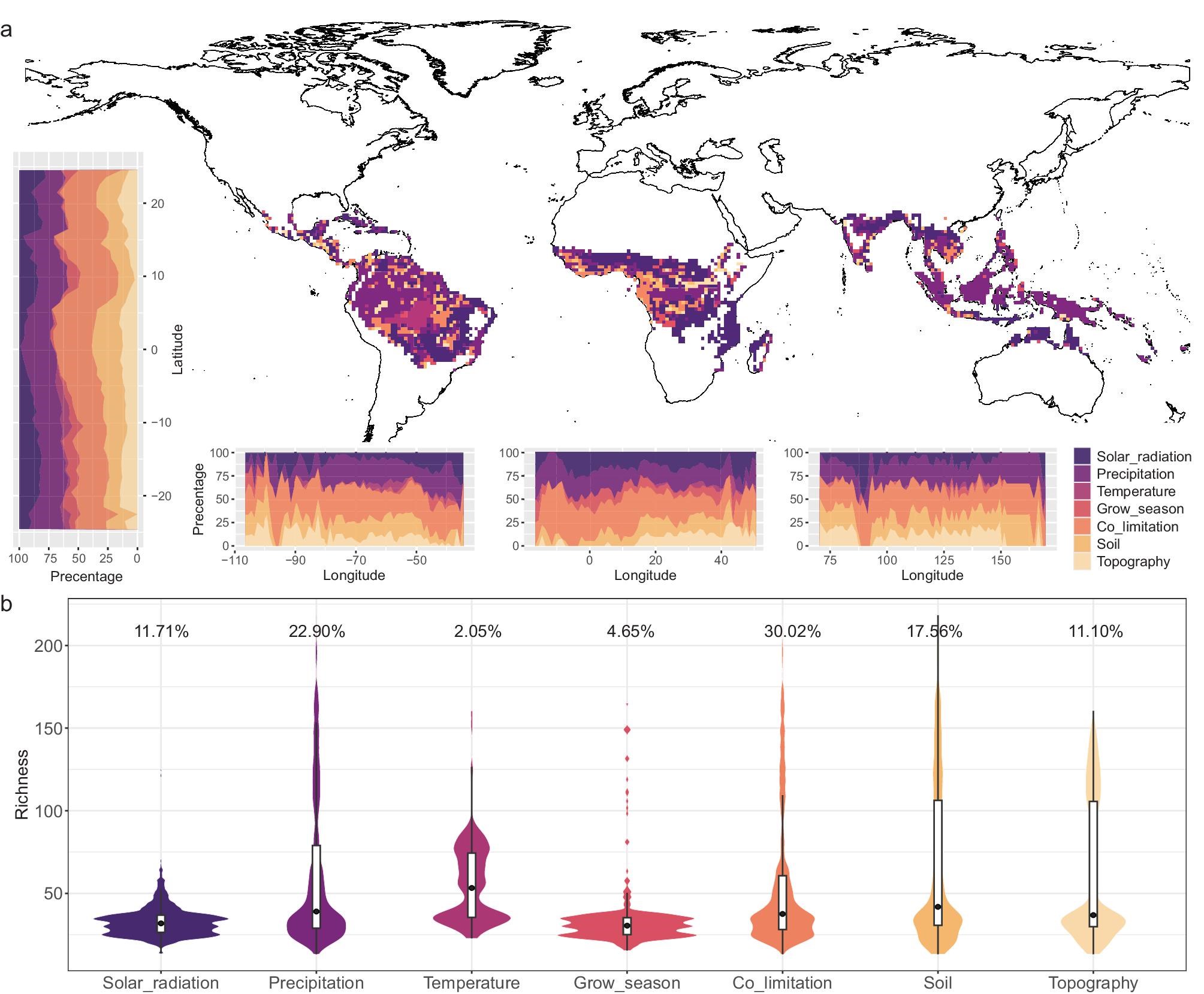 Geographical distribution of predominance of seven categories of environmental variables. Co-limitation refers to areas in which no single factor dominates. (a) Driving factors distribution pattern in pantropical regions, along longitude and latitude. (b) Percentage of main categories driving factors in tropical region.